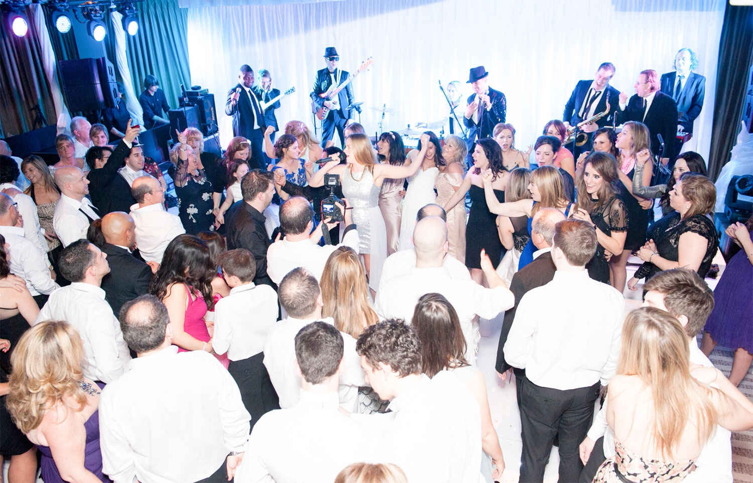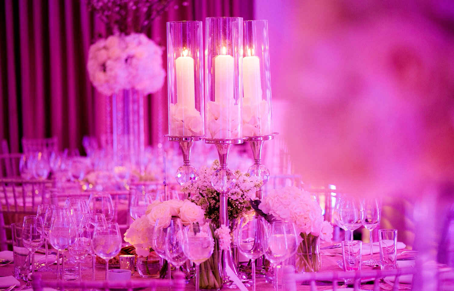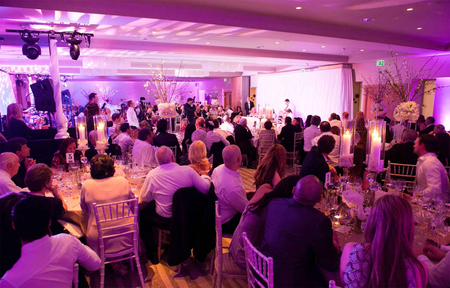 During the one hour turnaround time between the ceremony and breakfast, we once again transformed the room layout, bringing in a white star-lit dance floor and richening the lighting for the evening with shades of pink cast against the fabric backdrop. Working with high-end Kosher caterers we ensured that throughout the day, from the canapés to the evening buffet, all food was prepared and served in compliance with the Jewish faith. With our On the Day Management service taking care of every detail, the bride and groom were free to enjoy the klesma band and traditional Jewish dancing with their guests.
