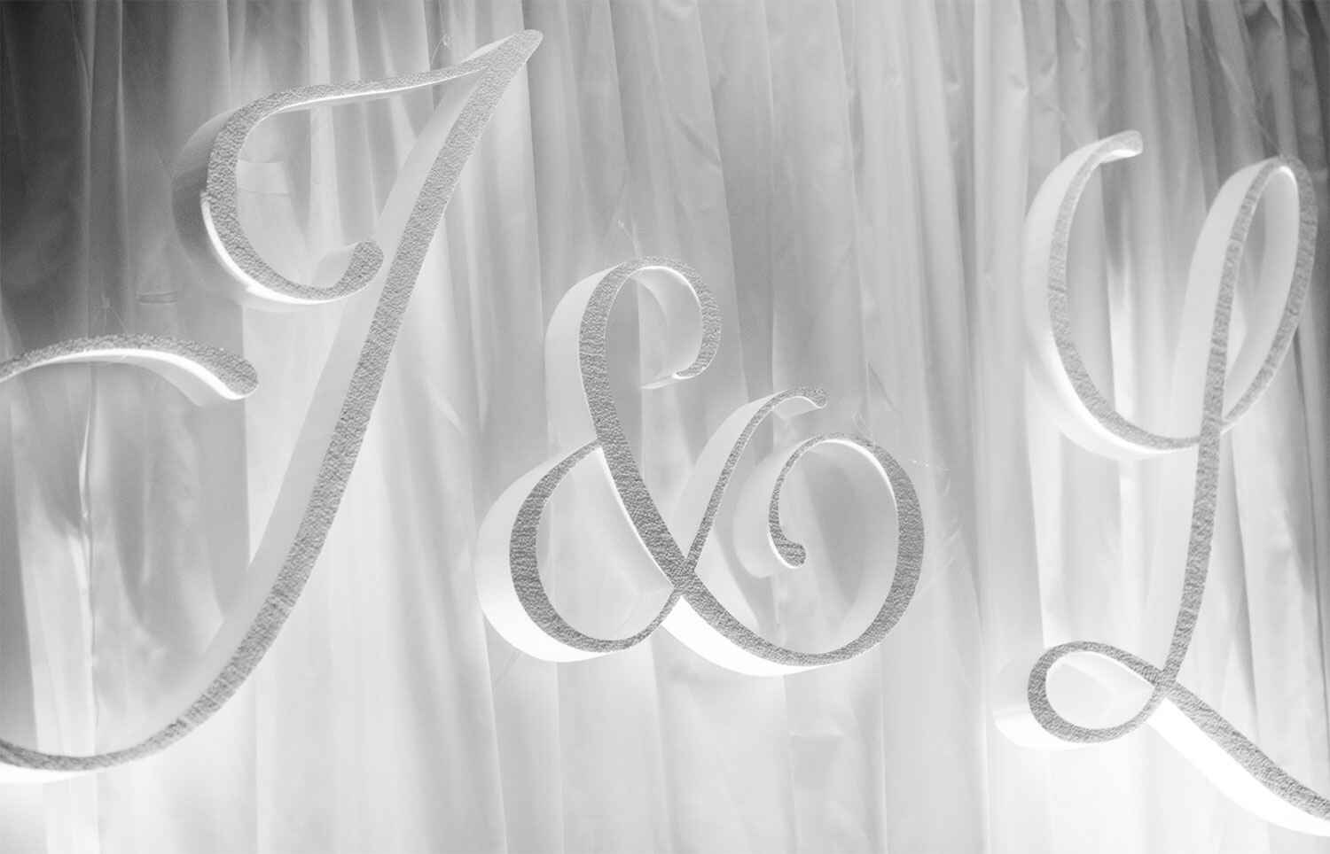 RESULT : Set on the peaceful banks of the Thames, the Runnymede Hotel & Spa was the perfect venue for this special day. Liaising closely with the hotel, we tailored the ceremony room to the couple’s tastes, bringing in alternative seating, a beautiful chuppah and advanced sound systems to ensure the “brachot” (blessings) were audible from the back. We dealt with key aspects such a sight lines and layout, centring the set design around a hard-backed, carpeted catwalk for the bridal party. Draping swathes of white voile around the room, we introduced character to the textured walls using subtle peach lighting which softened the feel of the large space and provided a backdrop against which their initials could be mounted. These giant letters would later become a key feature behind the top table. To commence the ceremony, separate rooms were decorated for the customary Jewish wedding traditions such as a bedecking and a minyan.